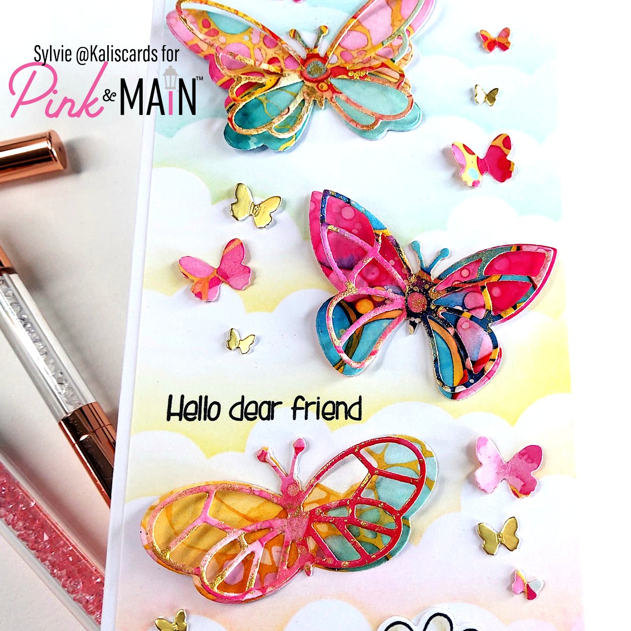 #pinkandmain Butterfly friends stamp and die sets, Rainy day stamp and die sets, Colorful ink spots 6x6 paper pad, Layered butterflies dies, Cloudy day stencil, Heart a flutter dies and Radiating butterflies stencil